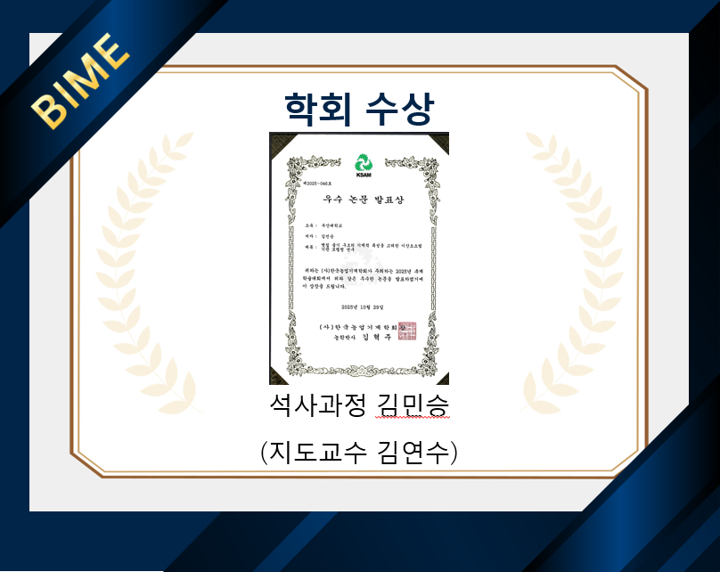 석사과정 김민승 학생이 [볏짚 줄기 구조의 기계적 특성을 고려한 이산요소법 기반 모델링 연구]로 우수 논문 발표상을 수상하였습니다.