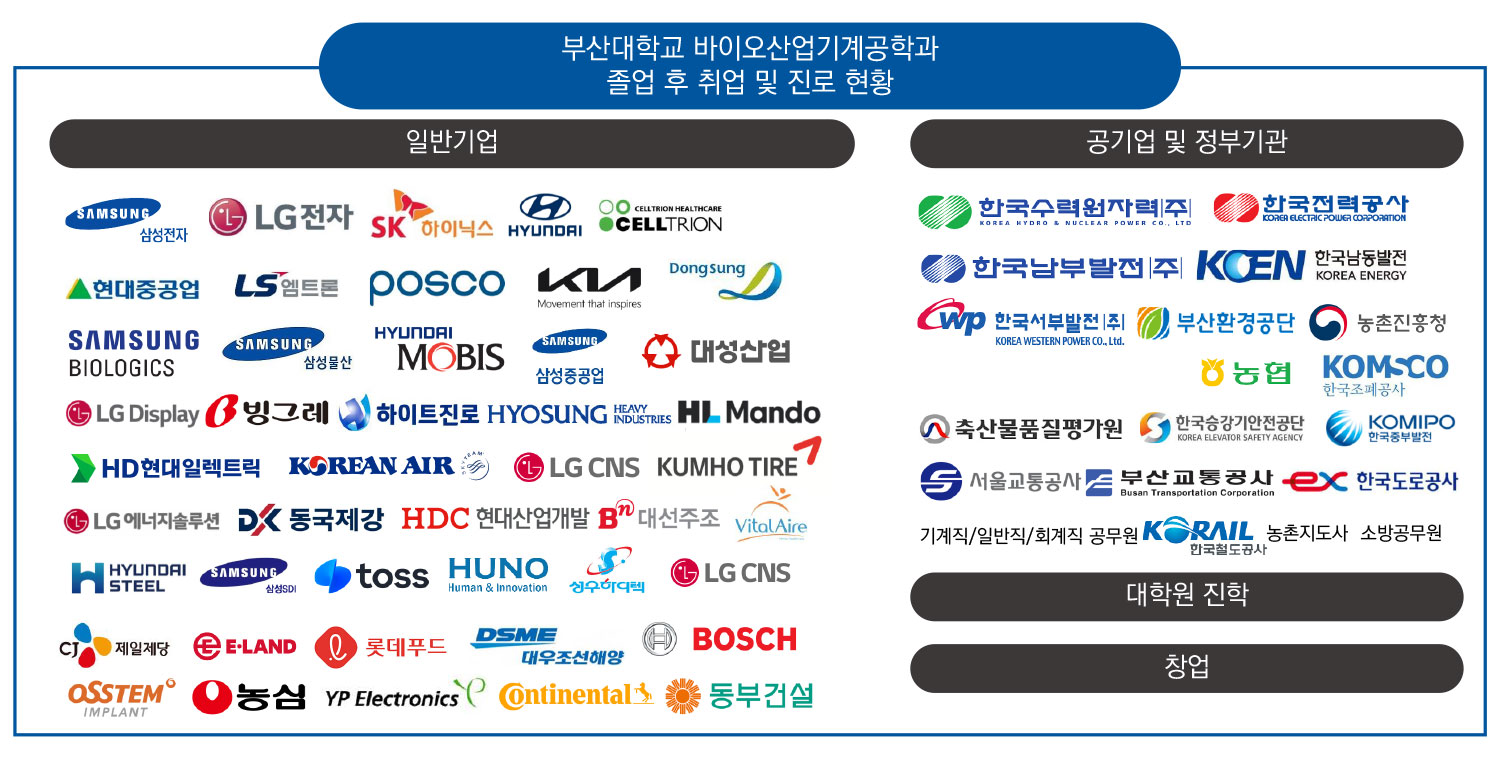 졸업 후 진로 공국가기관 연구소 및 국내 대기업 의료기기 전문 분야(병원 및 의료기기회사) 중등교사, 대학원 진학, 벤처 창업 기계산업 및 식품회사, 물류포장관련 기업 평생직업에 대비하여 기계,건설 및 물류관련 각종 기사 자격증 취득 그림을 클릭하시면 원본이미지로 보실 수 있습니다.